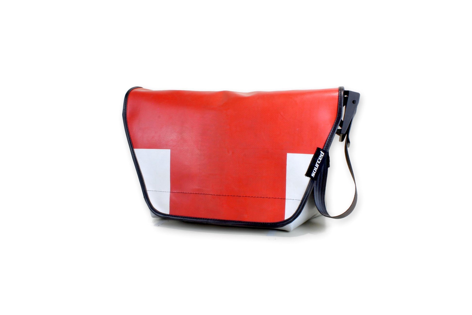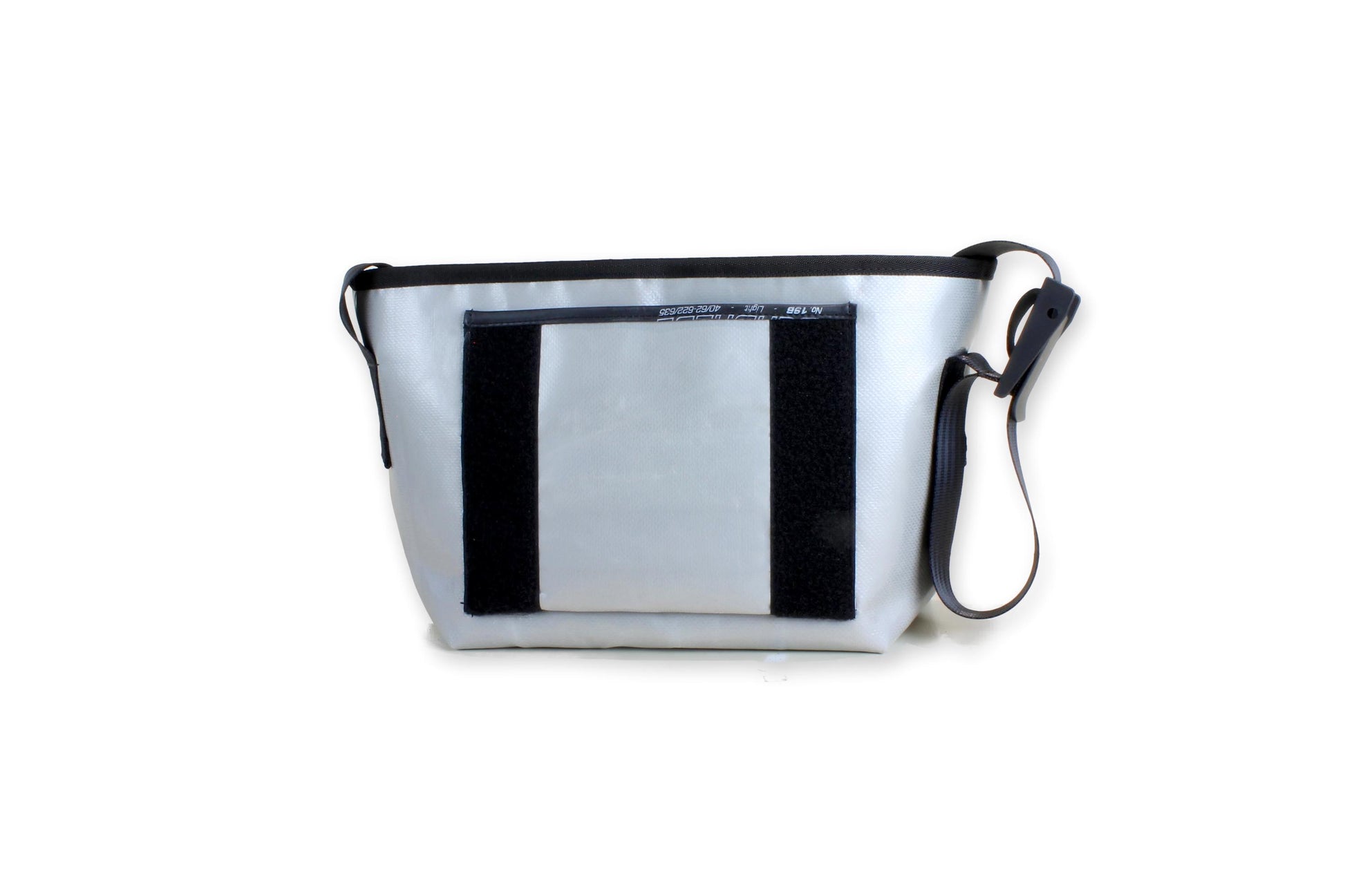 Wie alle unsere LKW-Planenprodukte ist jede Tasche ein Unikat und kann Gebrauchsspuren aufweisen. Alle unsere Taschen werden in unserer Werkstatt in Cornwall von Hand geschnitten und genäht.