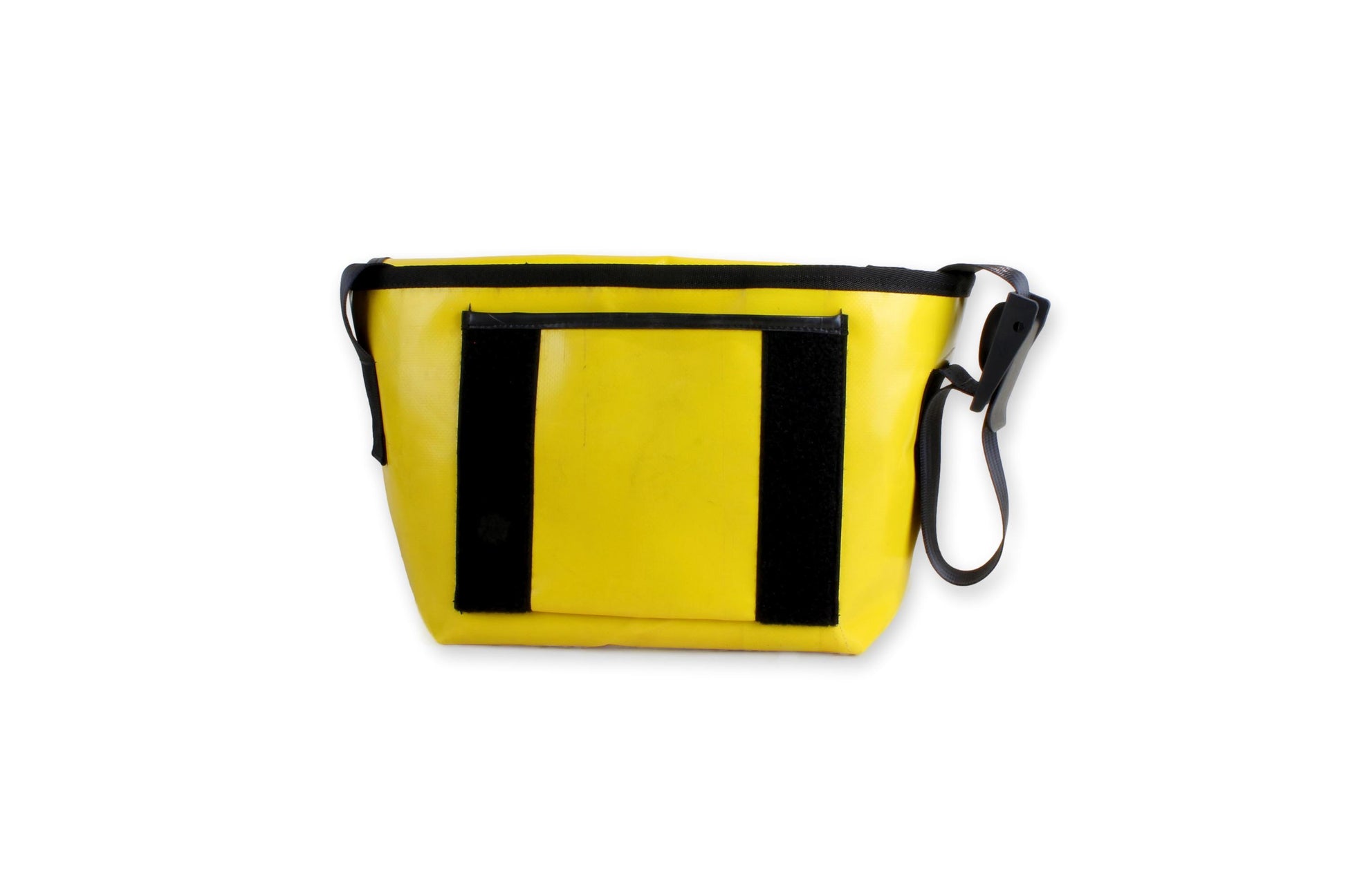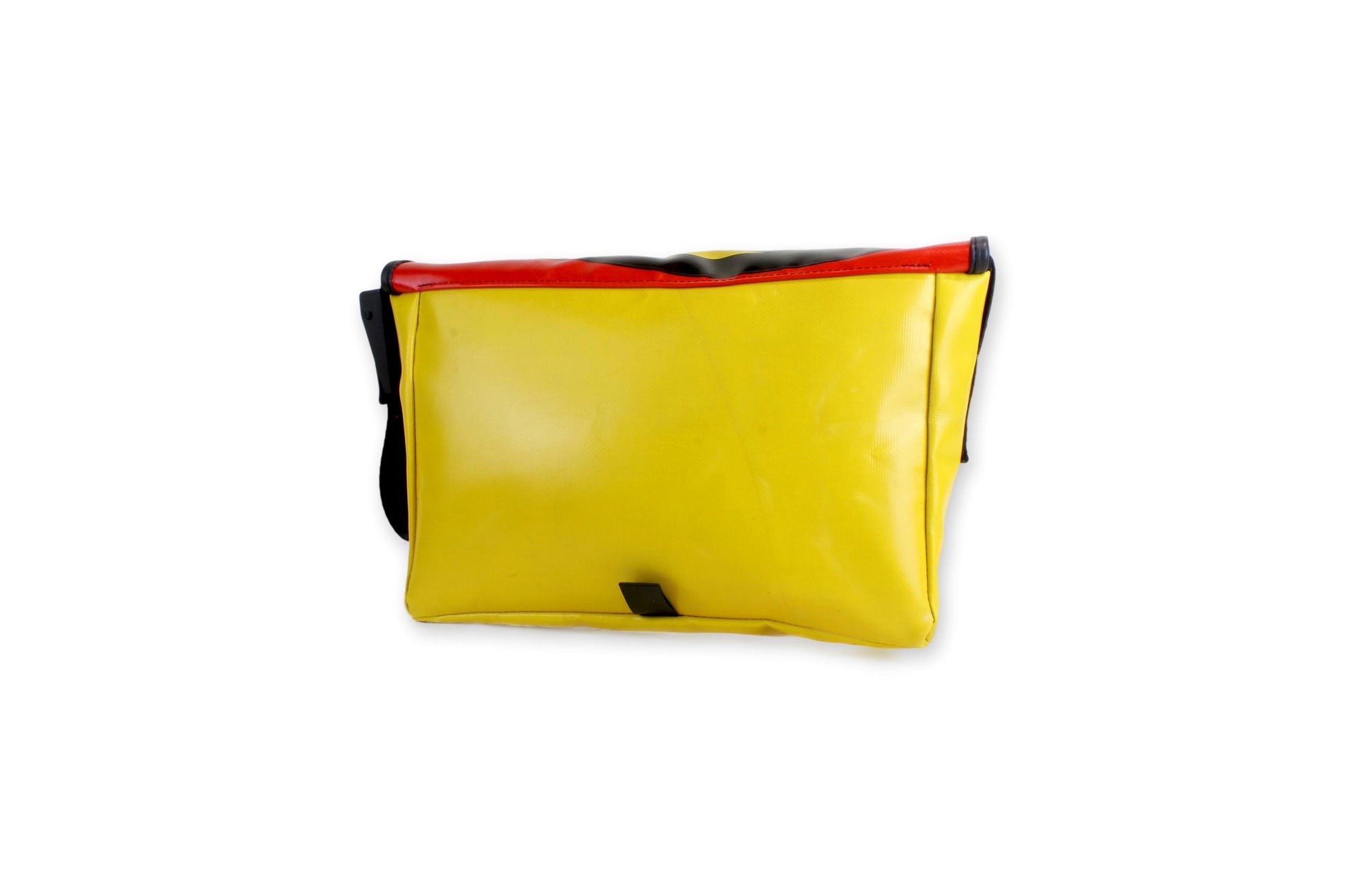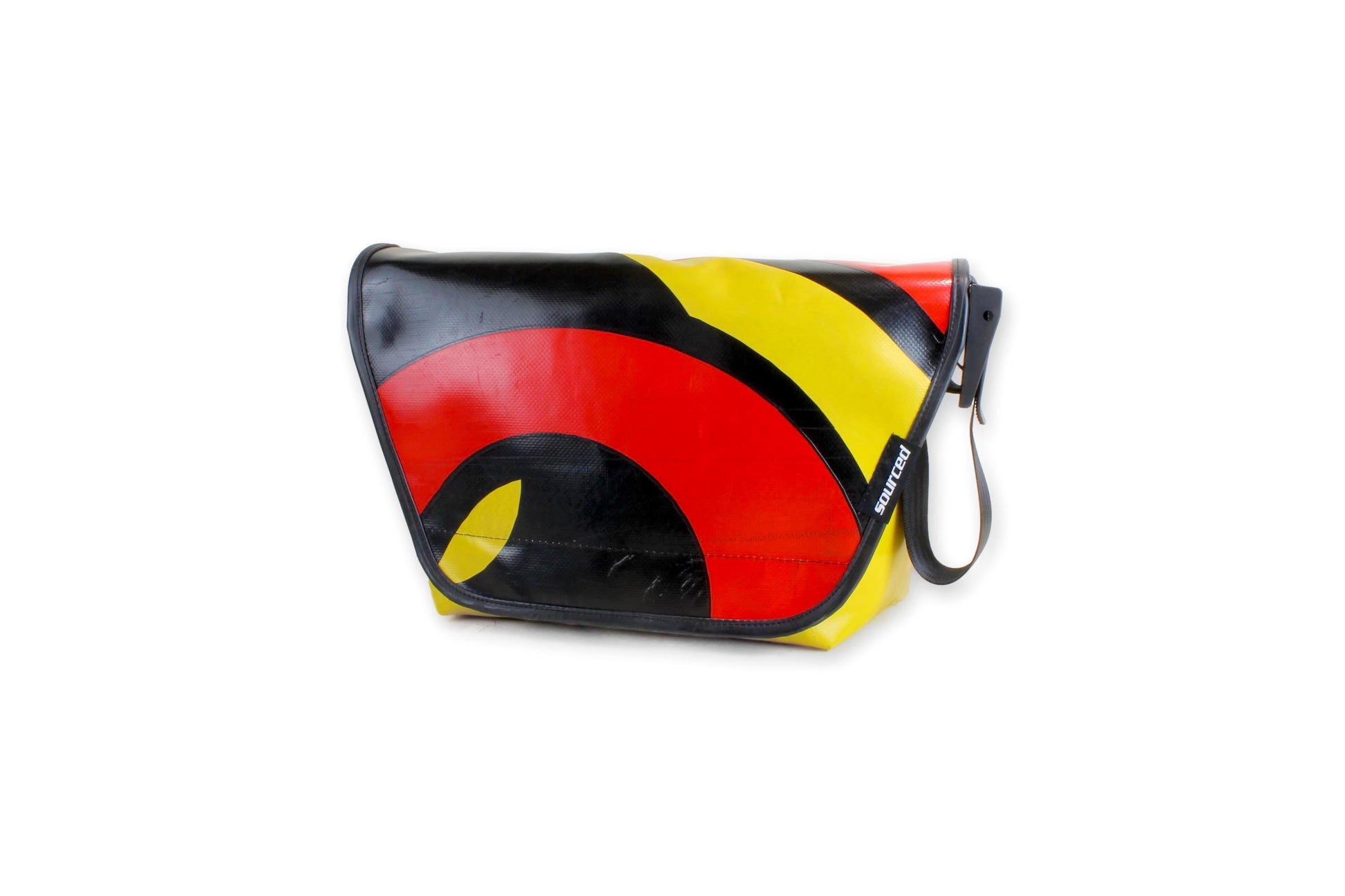 Our classic medium Messenger bag, crafted from recycled truck tarpaulin, fits a 13" laptop and more. Each bag is unique, showcasing the marks of its previous life.
