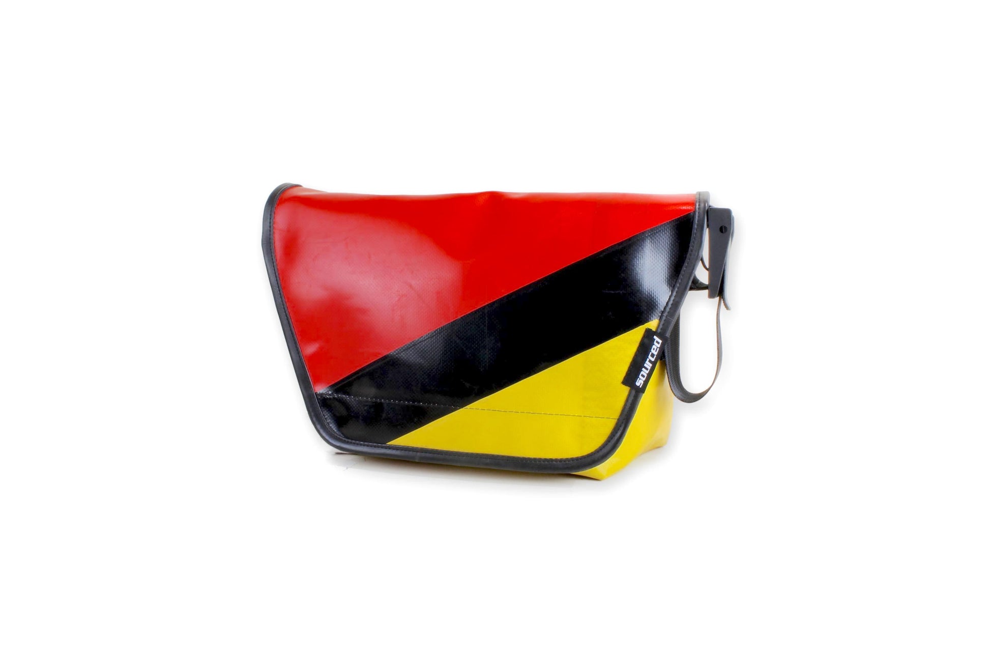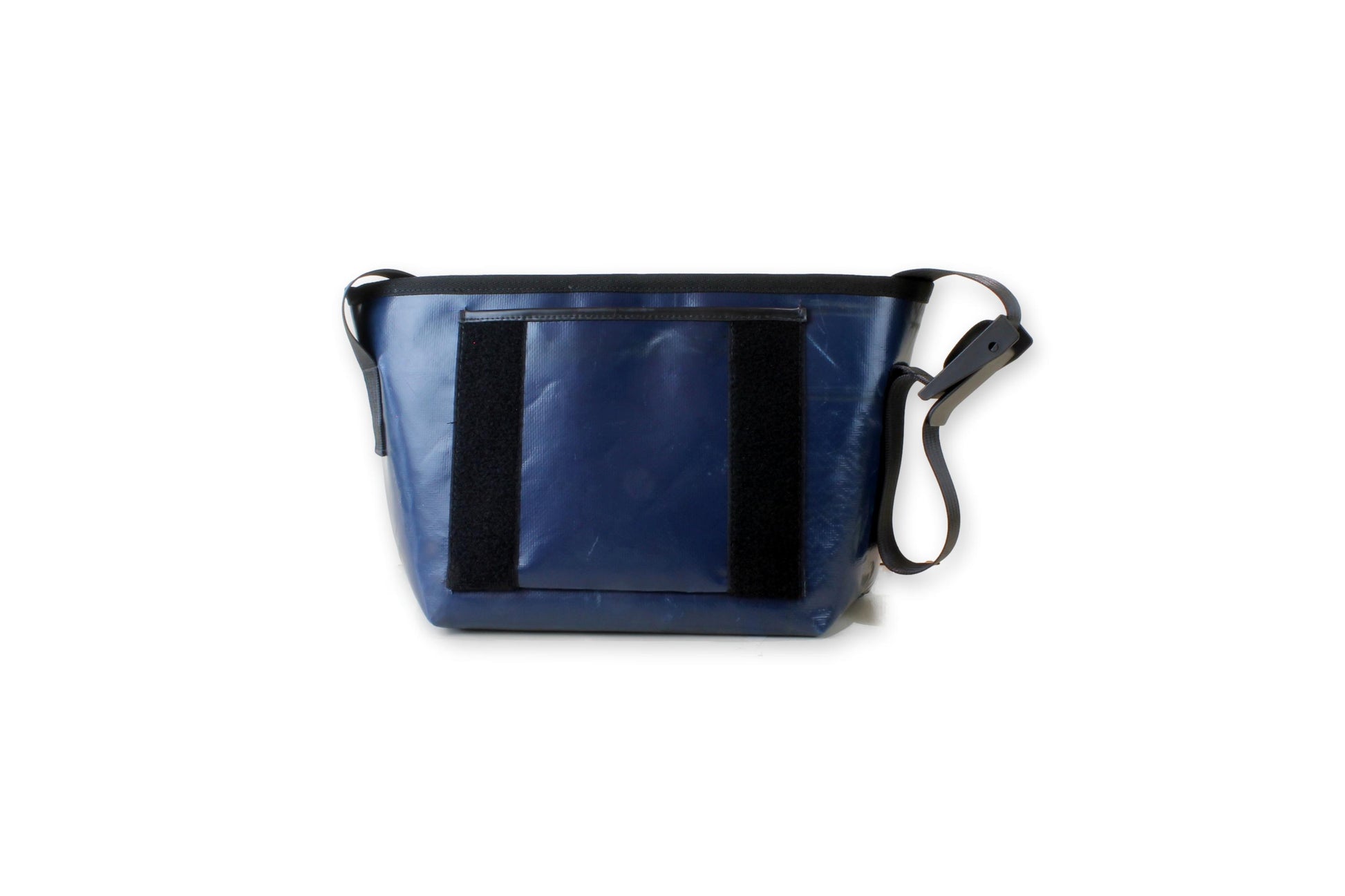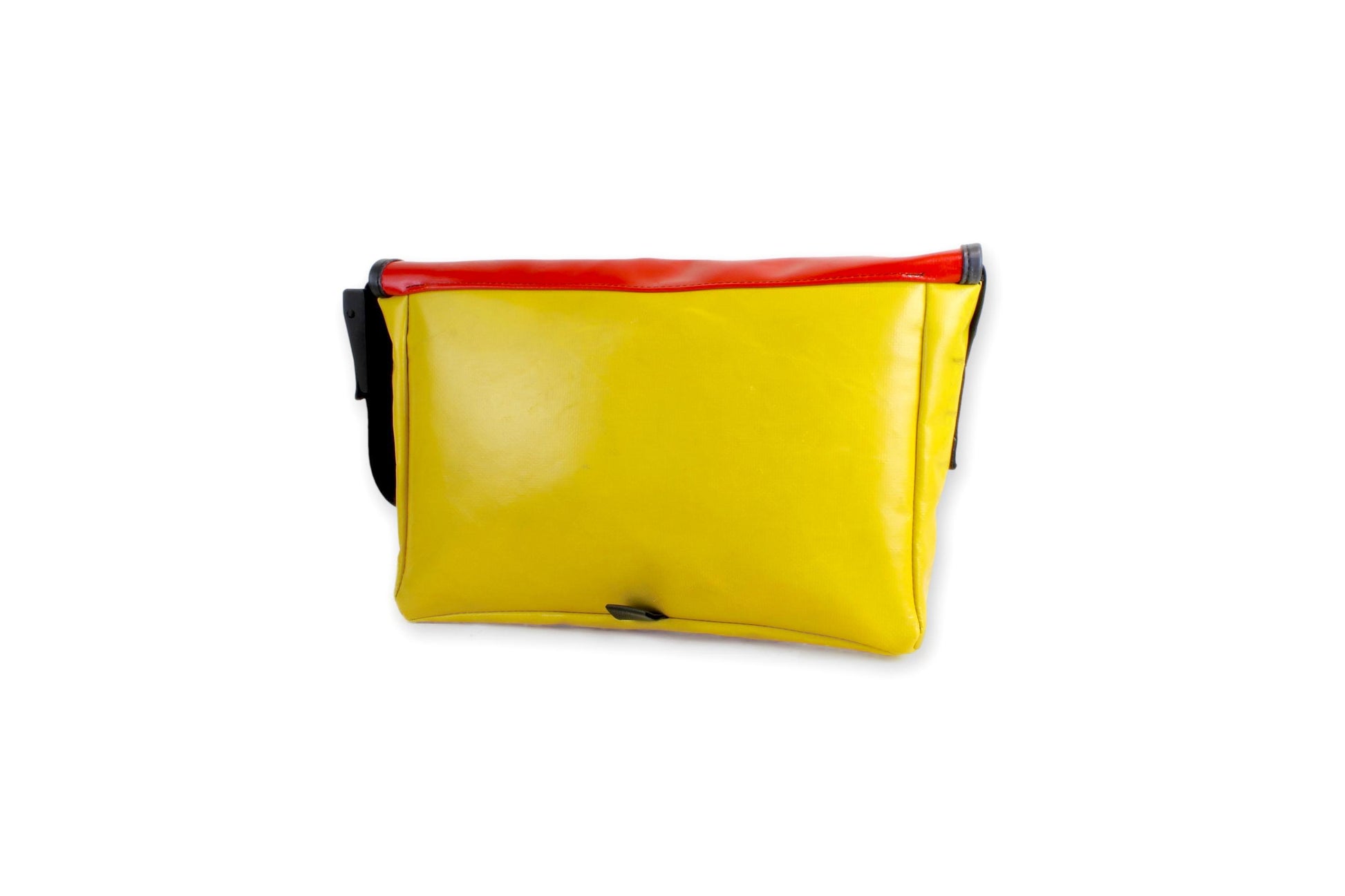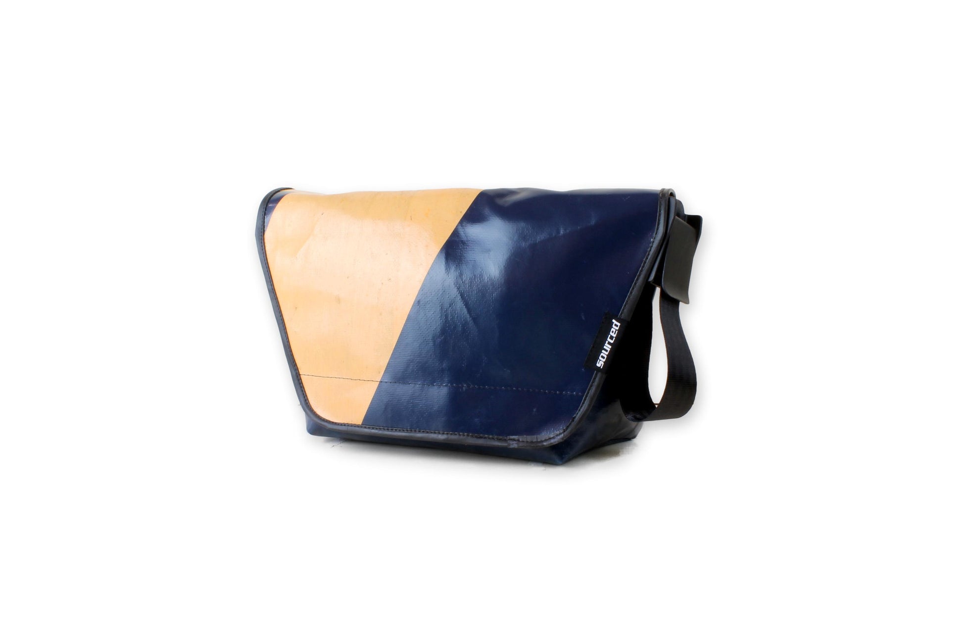 Our classic medium Messenger bag, crafted from recycled truck tarpaulin, fits a 13" laptop and more. Each bag is unique, showcasing the marks of its previous life.