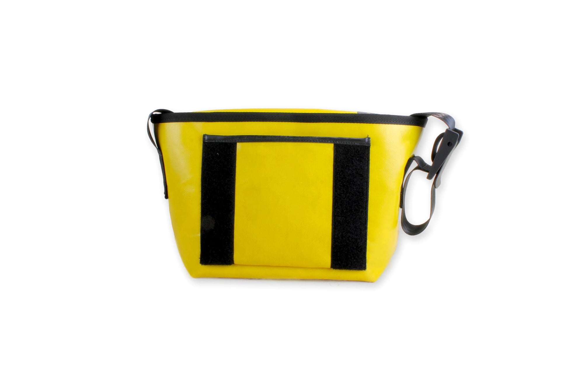 Truck tarp gets around. With many miles traveled it often displays scars from a previous life. We thoroughly clean all material and check for damage before repurposing into a new, functional bag. Down, but not out.
