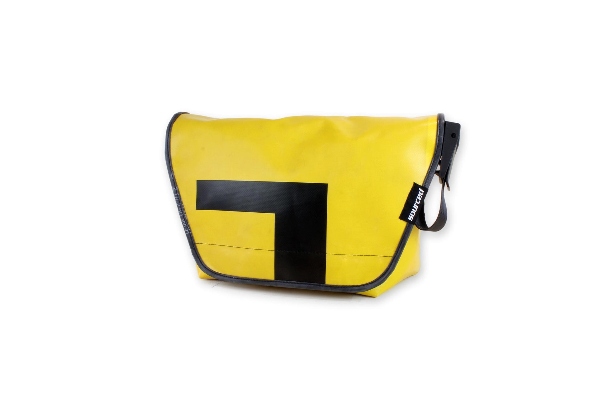 Our classic medium Messenger bag, crafted from recycled truck tarpaulin, fits a 13" laptop and more. Each bag is unique, showcasing the marks of its previous life.