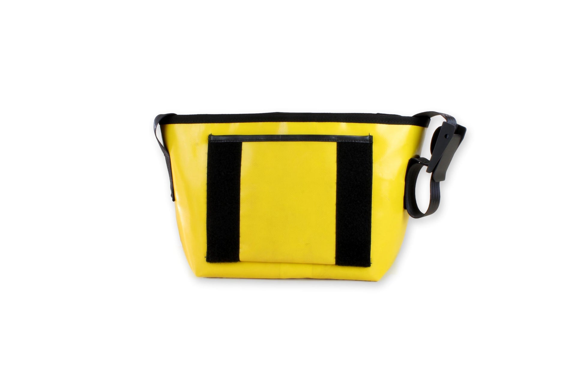 Truck tarp gets around. With many miles traveled it often displays scars from a previous life. We thoroughly clean all material and check for damage before repurposing into a new, functional bag. Down, but not out.